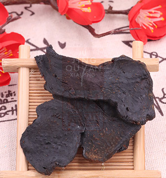 【性狀】本品呈不規(guī)則的厚片。表面棕褐色至黑色,有光澤,中心棕色至淺褐色,可見筋脈小點。質(zhì)較柔軟,味甜,微有酒香氣。